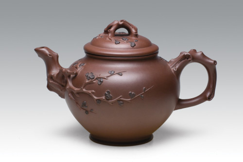 謝曼倫承繼紫砂花貨朱、蔣二氏名門?;ㄘ浰芷黝愖仙笆菍儆谀M自然形態(tài)的陶藝作品,這類作品的造型素材都是取自于自然植物、花葉、果實、根莖和枝葉,或配以鳥禽等組合,經(jīng)過概括、夸張、取舍、因器定形等手法,構(gòu)成壺藝造型形態(tài),藝術(shù)地再現(xiàn)自然。這類仿生象形壺藝作品,按照紫砂與茶文化品茗鑒賞的理與趣相結(jié)合的品味要求,做到雅而不俗,用器皿去模擬自然,造型與結(jié)構(gòu)賞用兼?zhèn)?、泥料巧色樸而不艷,得形易出神難。謝曼倫在多年的紫砂耕耘中,創(chuàng)作出多款以竹、松、梅為題材的優(yōu)秀代表作品?!渡殙亍返某晒ν瞥?,則是她從事花貨創(chuàng)意塑造道路上的又一飛躍,并成為其代表作品,得到紫砂愛好者的青睞和壺藝界同仁的高度贊譽。
